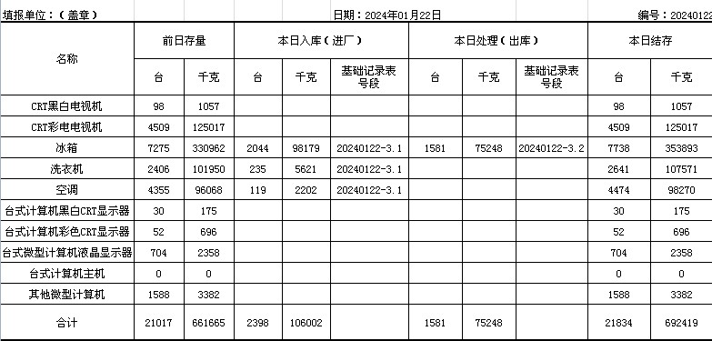 2024.01.22回收拆解統(tǒng)計(jì)表