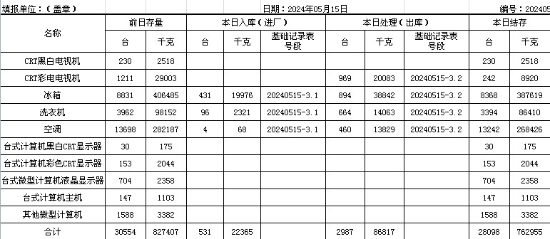 2024.05.15回收拆解統(tǒng)計(jì)表