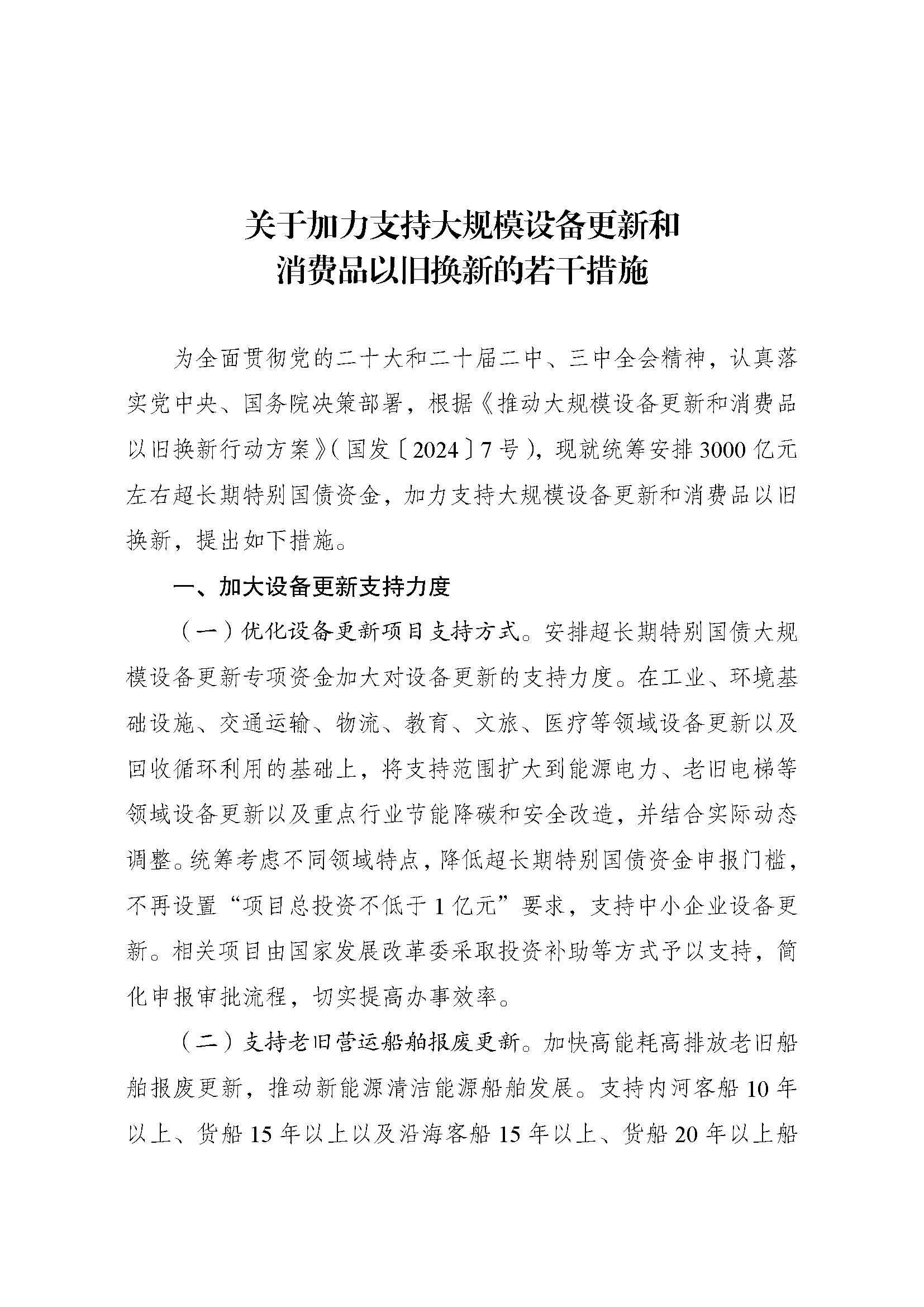 《關(guān)于加力支持大規(guī)模設(shè)備更新和消費(fèi)品以舊換新的若干措施》已經(jīng)國務(wù)院同意。現(xiàn)印發(fā)給你們,請認(rèn)真貫徹落實(shí)。