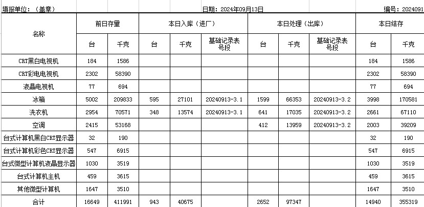 2024.09.13回收拆解統(tǒng)計(jì)表