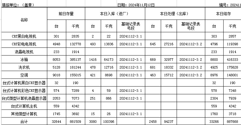 2024.11.12回收拆解統(tǒng)計(jì)表