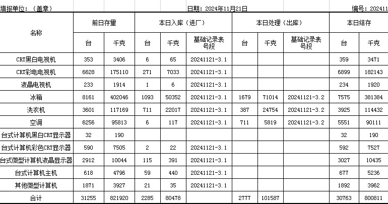2024.11.21回收拆解統(tǒng)計(jì)表