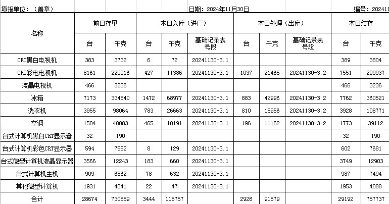 2024.11.30回收拆解統(tǒng)計(jì)表