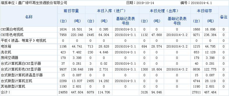 2019.10.14回收拆解統(tǒng)計(jì)表