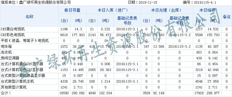 2019.11.15回收拆解統(tǒng)計(jì)表