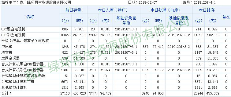 2019.12.06回收拆解統(tǒng)計(jì)表