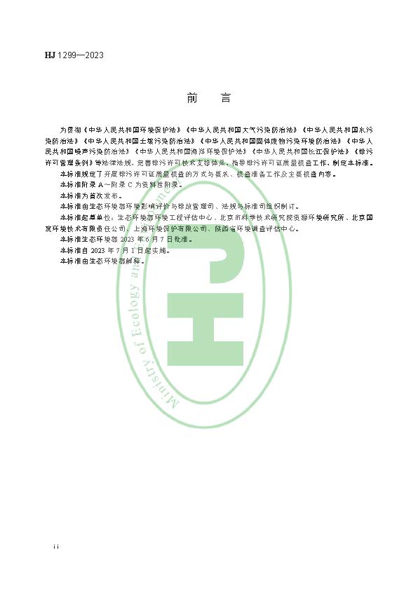 為貫徹《中華人民共和國環(huán)境保護法》《中華人民共和國大氣污染防治法》《中華人民共和國水污染防治法》《中華人民共和國土壤污染防治法》《中華人民共和國固體廢物污染環(huán)境防治法》《中華人 民共和國噪聲污染防治法》《中華人民共和國海洋環(huán)境保護法》《中華人民共和國長江保護法》《排污許可管理條例》等法律法規(guī),完善排污許可技術(shù)支撐體系,指導排污許可證質(zhì)量核查工作,制定本標準。本標準規(guī)定了開展排污許可證質(zhì)量核查的方式與要求、核查準備工作及主要核查內(nèi)容。本標準附錄A~附錄C 為資料性附錄。本標準為首次發(fā)布。