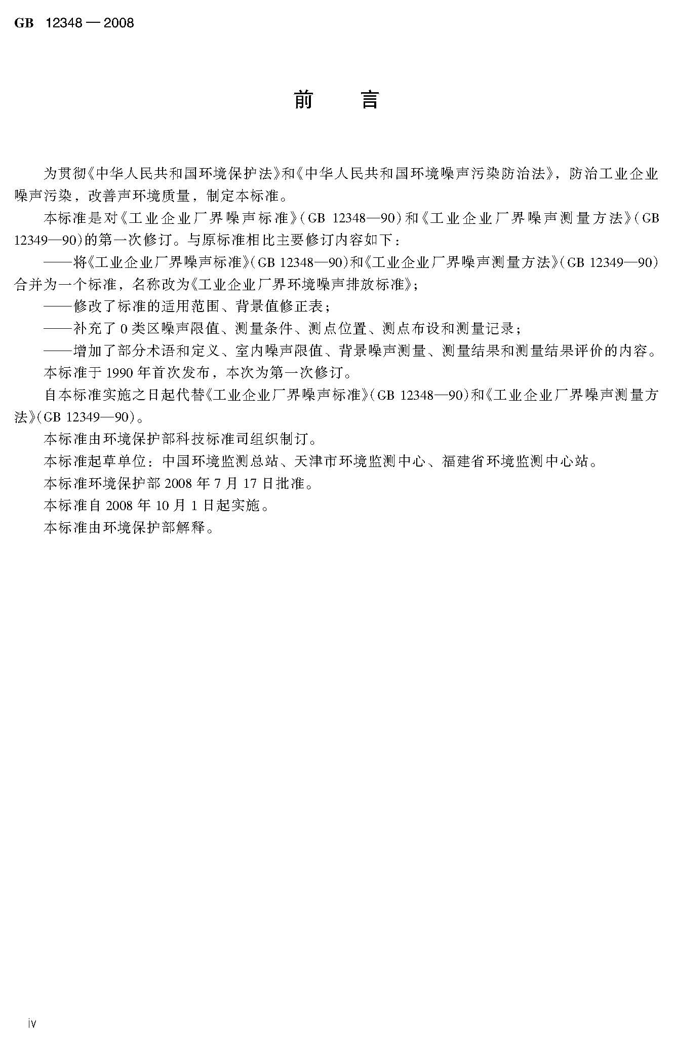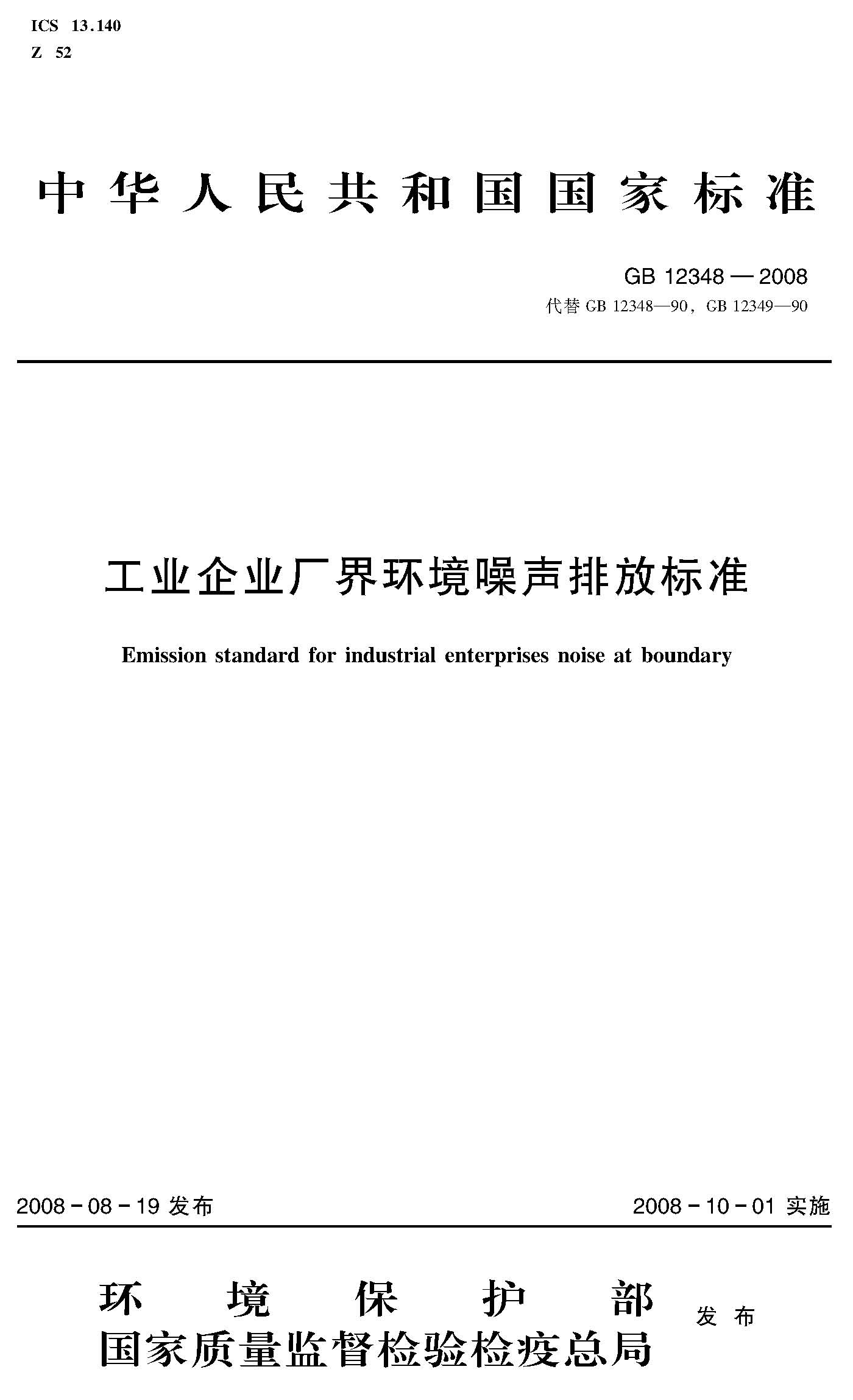 為貫徹《中華人民共和國環(huán)境保護(hù)法》和《中華人民共和國環(huán)境噪聲污染防治法》,防治工業(yè)企業(yè)噪聲污染,改善聲環(huán)境質(zhì)量,制定本標(biāo)準(zhǔn)。本標(biāo)準(zhǔn)是對(duì)GB 12348-90《工業(yè)企業(yè)廠界噪聲標(biāo)準(zhǔn)》和GB 12349-90《工業(yè)企業(yè)廠界噪聲測量方法》的第一次修訂。本標(biāo)準(zhǔn)規(guī)定了工業(yè)企業(yè)和固定設(shè)備廠界環(huán)境噪聲排放限值及其測量方法。本標(biāo)準(zhǔn)適用于工業(yè)企業(yè)噪聲排放的管理、評(píng)價(jià)及控制。機(jī)關(guān)、事業(yè)單位、團(tuán)體等對(duì)外環(huán)境排放噪聲的單位也按本標(biāo)準(zhǔn)執(zhí)行。本標(biāo)準(zhǔn)自實(shí)施之日起代替《工業(yè)企業(yè)廠界噪聲標(biāo)準(zhǔn)》(GB12348-90)和《工業(yè)企業(yè)廠界噪聲測量方法》(GB12349-90)。