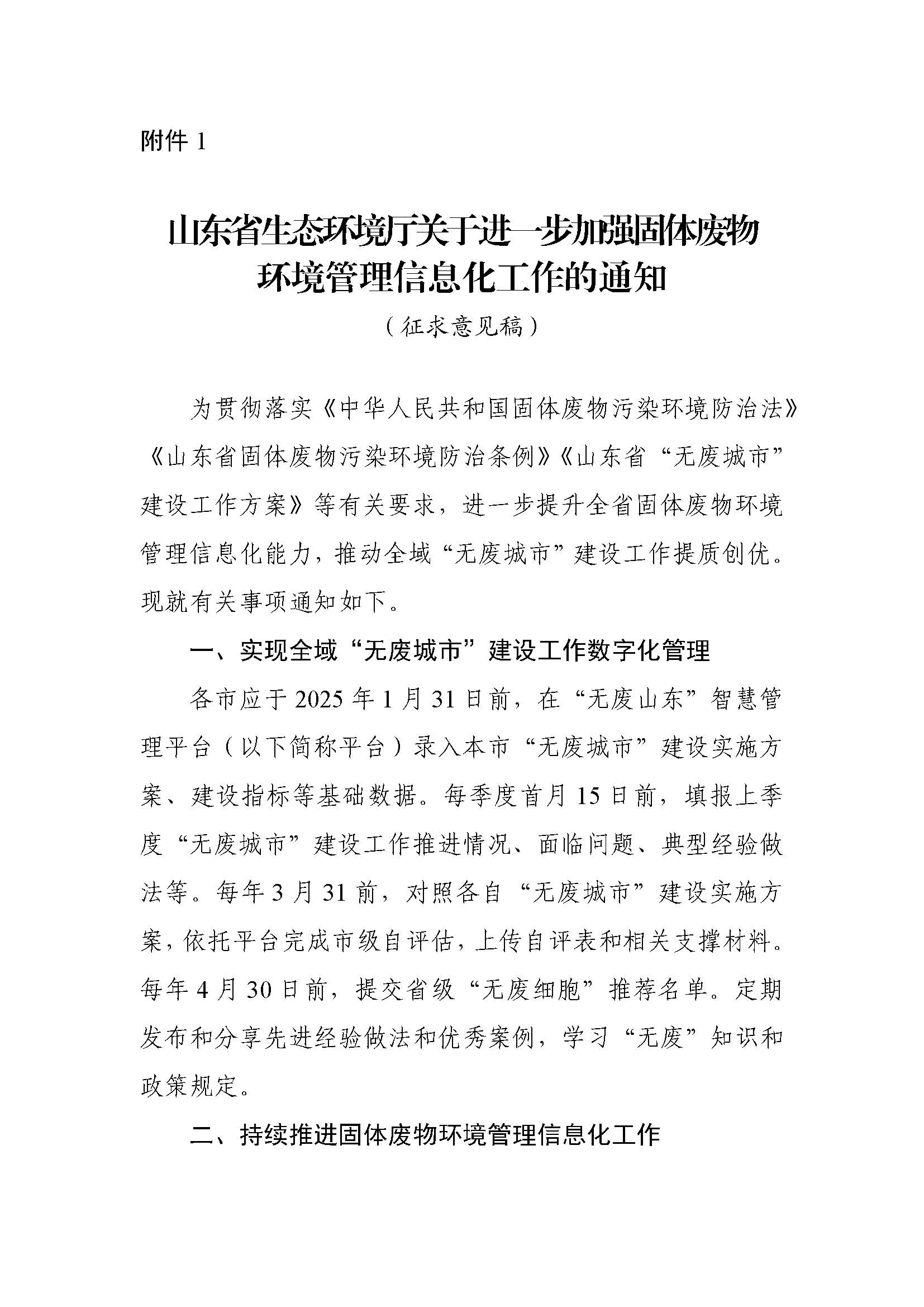 為貫徹落實(shí)《中華人民共和國(guó)固體廢物污染環(huán)境防治法》《山東省固體廢物污染環(huán)境防治條例》《山東省“無廢城市”建設(shè)工作方案》等有關(guān)要求,進(jìn)一步提升全省固體廢物環(huán)境管理信息化能力,推動(dòng)全域“無廢城市”建設(shè)工作,我廳組織起草了《關(guān)于進(jìn)一步加強(qiáng)固體廢物環(huán)境管理信息化工作的通知(征求意見稿)》,現(xiàn)公開征求意見,有關(guān)意見請(qǐng)于2024年12月27日前反饋至聯(lián)系人郵箱。
