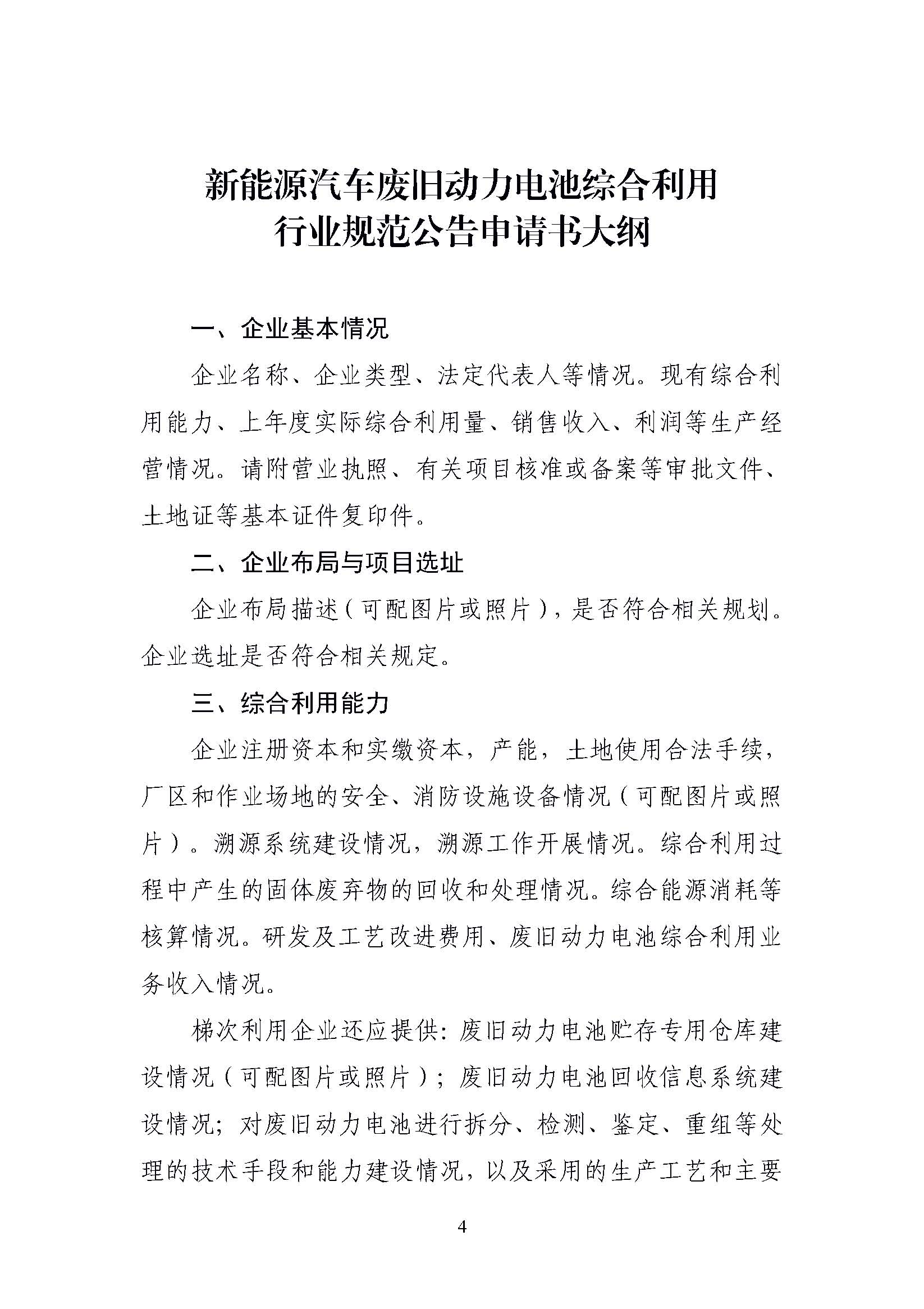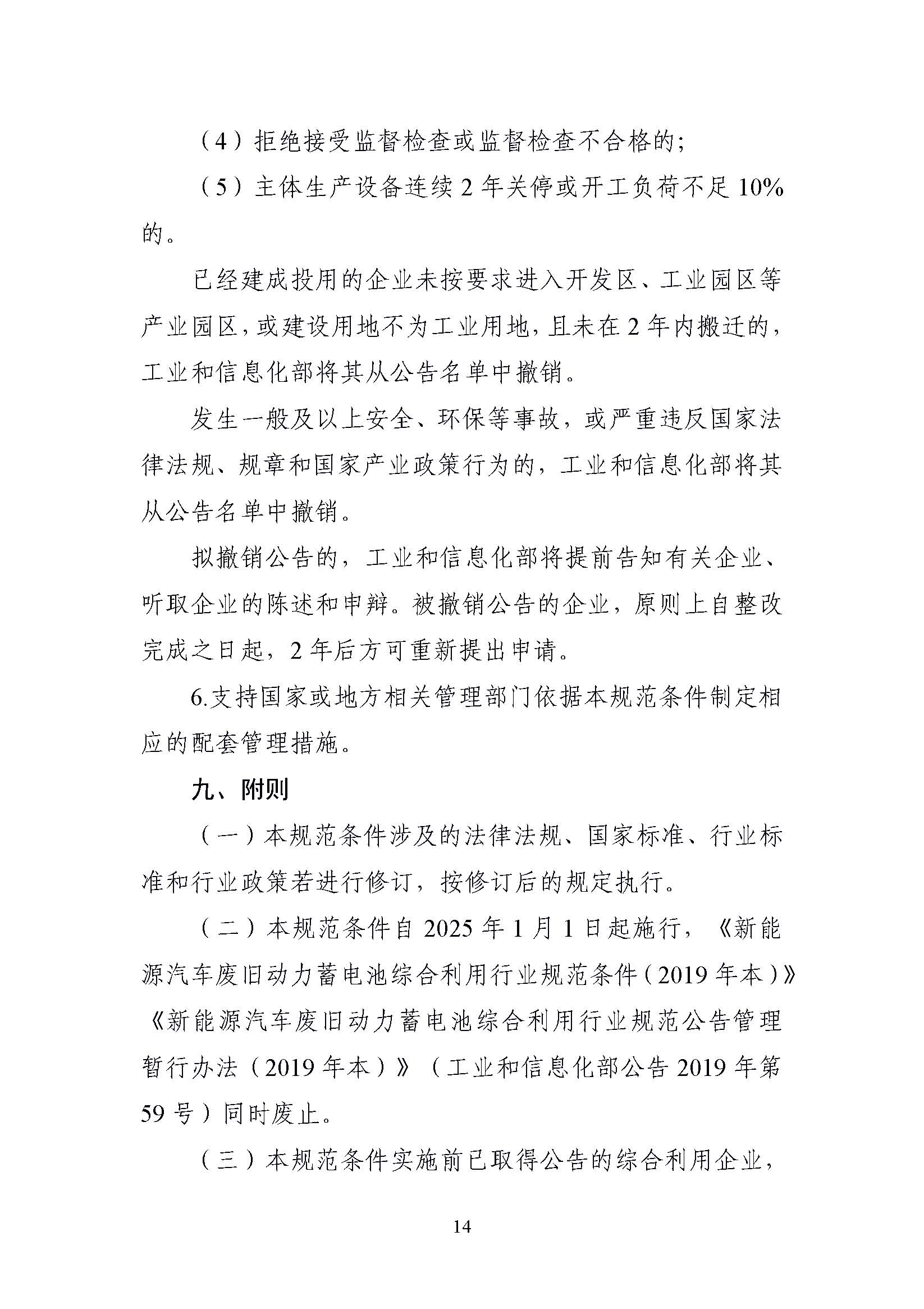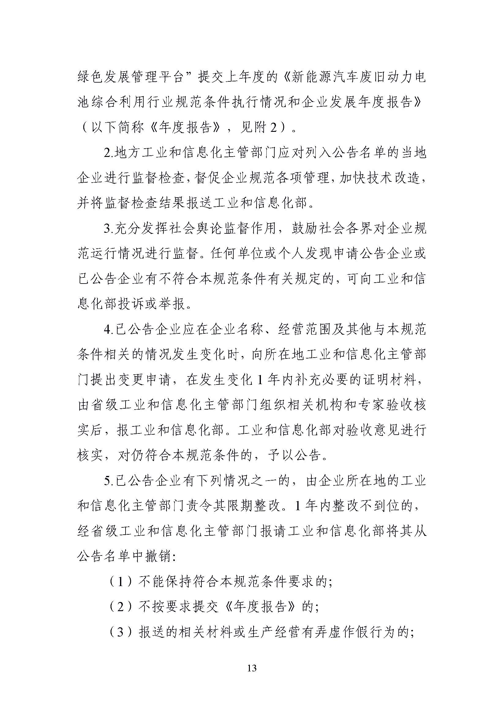 為加強(qiáng)新能源汽車(chē)廢舊動(dòng)力電池綜合利用行業(yè)管理,提高廢舊動(dòng)力電池綜合利用水平,我部對(duì)《新能源汽車(chē)廢舊動(dòng)力蓄電池綜合利用行業(yè)規(guī)范條件(2019年本)》進(jìn)行了修訂,形成《新能源汽車(chē)廢舊動(dòng)力電池綜合利用行業(yè)規(guī)范條件(2024年本)》,現(xiàn)予以公告?!缎履茉雌?chē)廢舊動(dòng)力蓄電池綜合利用行業(yè)規(guī)范條件(2019年本)》《新能源汽車(chē)廢舊動(dòng)力蓄電池綜合利用行業(yè)規(guī)范公告管理暫行辦法(2019年本)》(工業(yè)和信息化部公告2019年第59號(hào))同時(shí)廢止。
