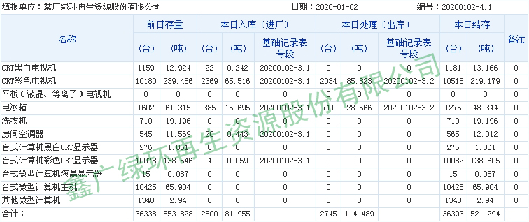 2020.01.02回收拆解統(tǒng)計(jì)表
