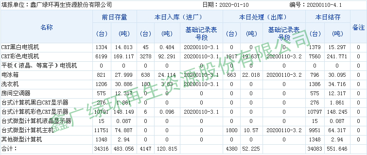 2020.01.11回收拆解統(tǒng)計(jì)表